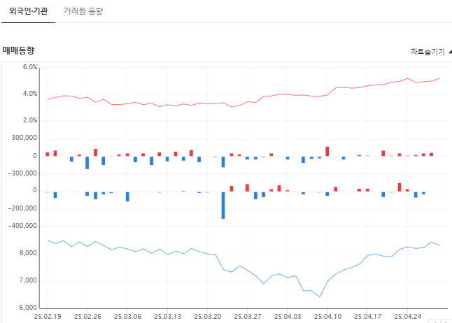 외국인의 거래의 경우 8거래일 째 지속적으로 매수하고 있으며, 외국인 지분량도 올라가고 있습니다.