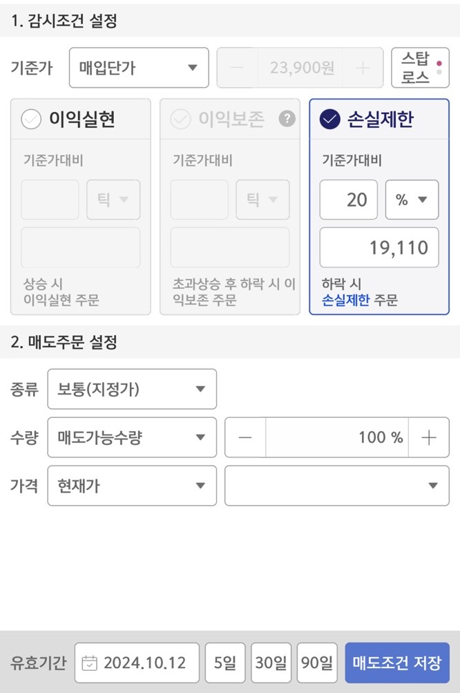 자동감시주문의 설정할 수 있는 기간은 HTS에서는 3개월, 모바일에서는 30일까지 설정할 수 있습니다. 급락할 경우 지정가 매도가 되지 않을 수 있는데요. 예를 들어, 급락한 가격에 내가 걸어 놓은 물량만큼 매수가 없으면 부분적으로 채결되겠죠. 시장가 매도 옵션을 함께 검토해 보시기 바랍니다.